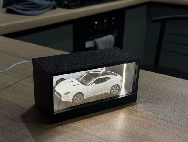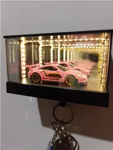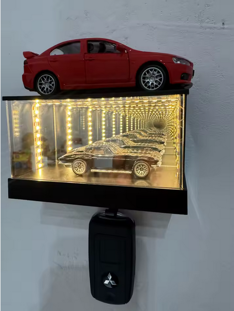 Inside the frame, a precision mirror tunnel system creates the illusion of infinite depth, turning your keys or scale cars into a floating garage display.